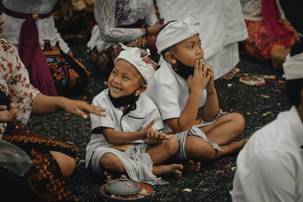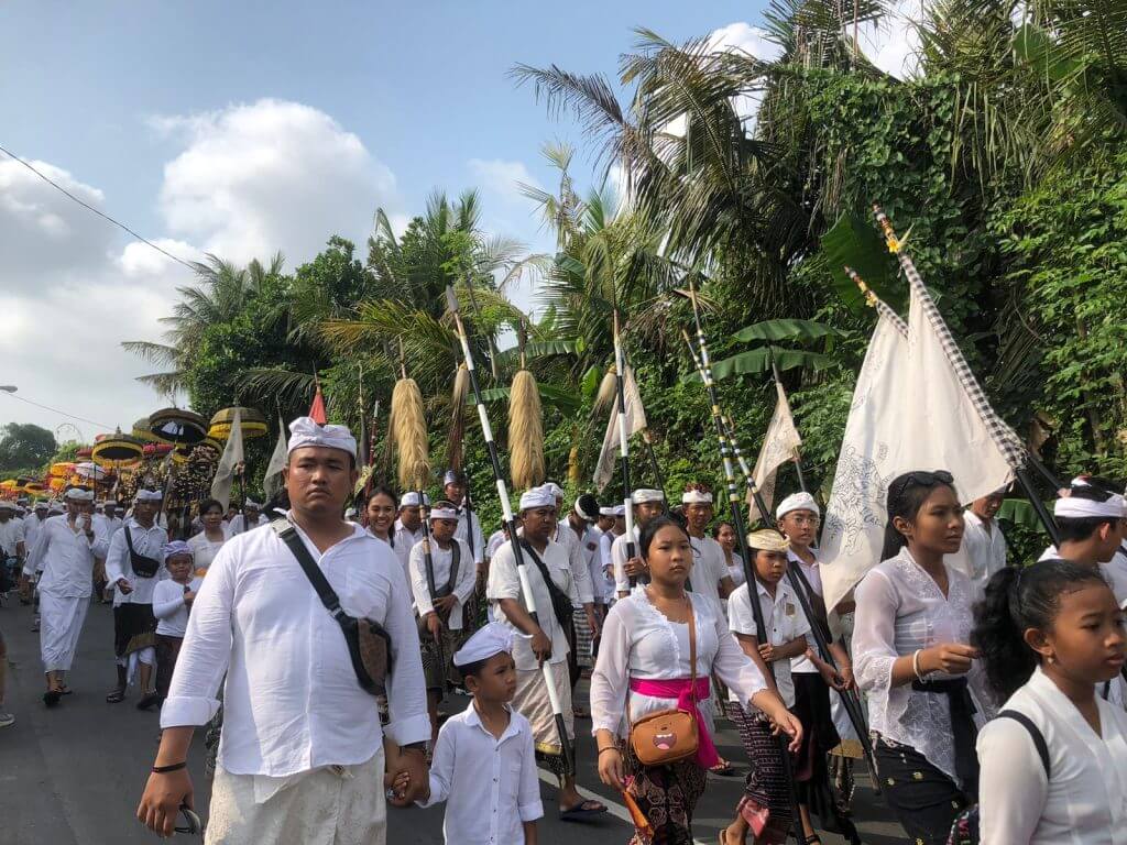 Avant le Nouvel An balinais, l’île se soumet à une purification spirituelle en réalisant des rituels sur une période de cinq à six jours. L’un de ces rituels, le Melasti, consiste à recueillir de l’eau sacrée pour purifier les temples et les âmes, symbolisant un nouveau départ. Les Balinais portent leur tenue traditionnelle blanche. (la kebaya pour les femmes) et des sarongs à carreaux, abandonnant symboliquement le passé tandis qu’ils réalisent cette cérémonie sacrée au bord de l’océan ou d’un lac.